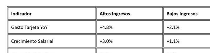 A pesar de que los datos de Bank of America muestran que el gasto de tarjetas de crédito creció 6% y los saldos solo 3% (gestionable), los ejecutivos afirman no ver evidencia de una economía K‑shaped donde los ricos prosperan y los pobres se hunden.