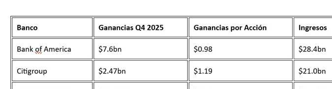 Los tres gigantes bancarios de Wall Street cerraron 2025 con resultados históricos. Bank of America reportó ganancias de 7,600 millones de dólares en el cuarto trimestre (un aumento del 12% interanual), Citigroup superó expectativas con ingresos de 21,000 millones a pesar de una pérdida por su salida de Rusia, y JPMorgan Chase registró ganancias de $13,030 millones (4.63 dólares por acción), aunque ajustadas por la adquisición de Apple Card alcanzaron $5.23 dólares por acción.