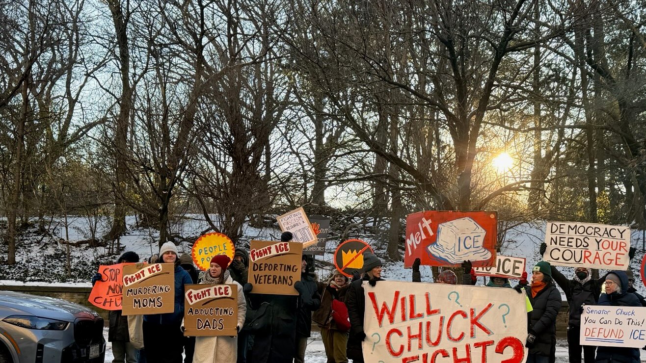 Bajo temperaturas congelantes manifestantes exigen al senador demócrata que corte dinero a ICE.