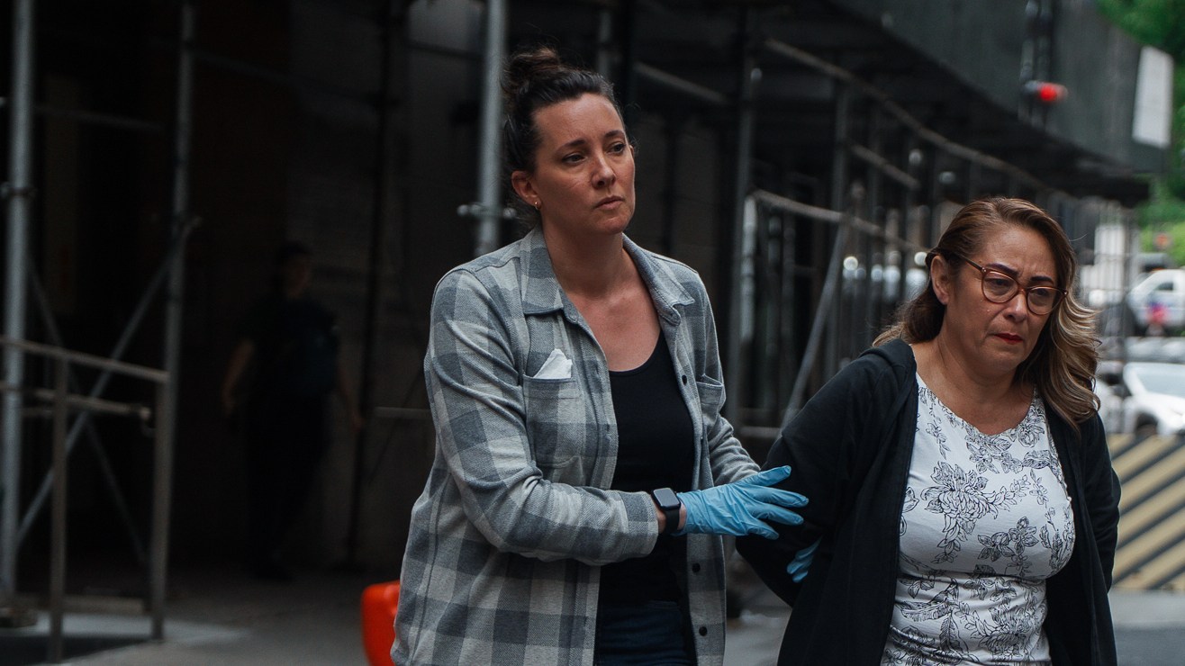 Agentes federales escoltan a detenidos esposados ​​tras arrestarlos en un control rutinario de ICE en Nueva York en junio del año pasado. Crédito: Olga Fedorova | AP