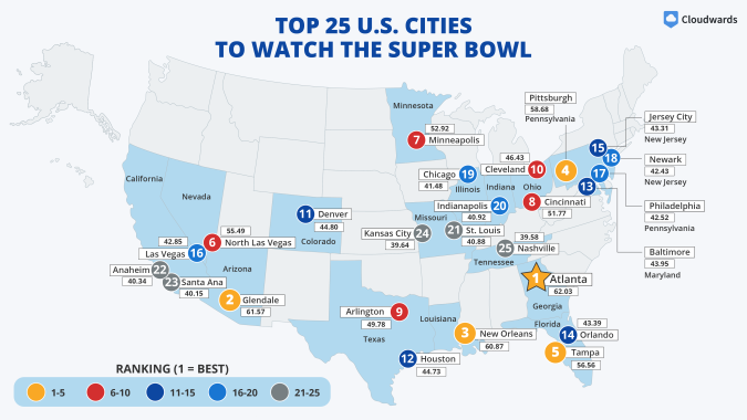 5 de las 10 primeras ciudades se ubican en el sur o suroeste del país, lo que confirma una fuerte relación entre esa región y la cultura del fútbol americano. Atlanta, Glendale (Arizona) y Nueva Orleans lideran el podio, mientras Tampa, North Las Vegas y Arlington (Texas) también figuran entre las mejores.