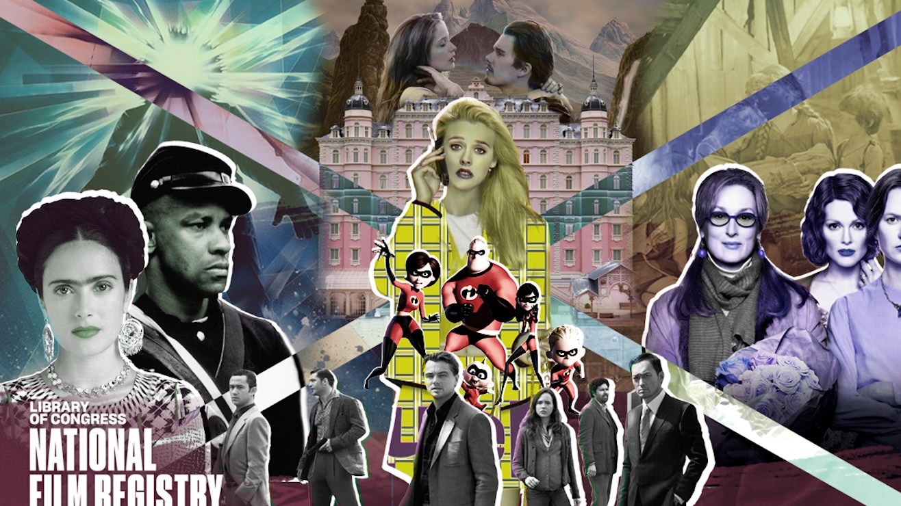 Collage promocional del National Film Registry 2025 con escenas de las 25 películas seleccionadas, incluyendo Frida, Glory, The Grand Budapest Hotel, Clueless, The Incredibles, Inception y The Hours.