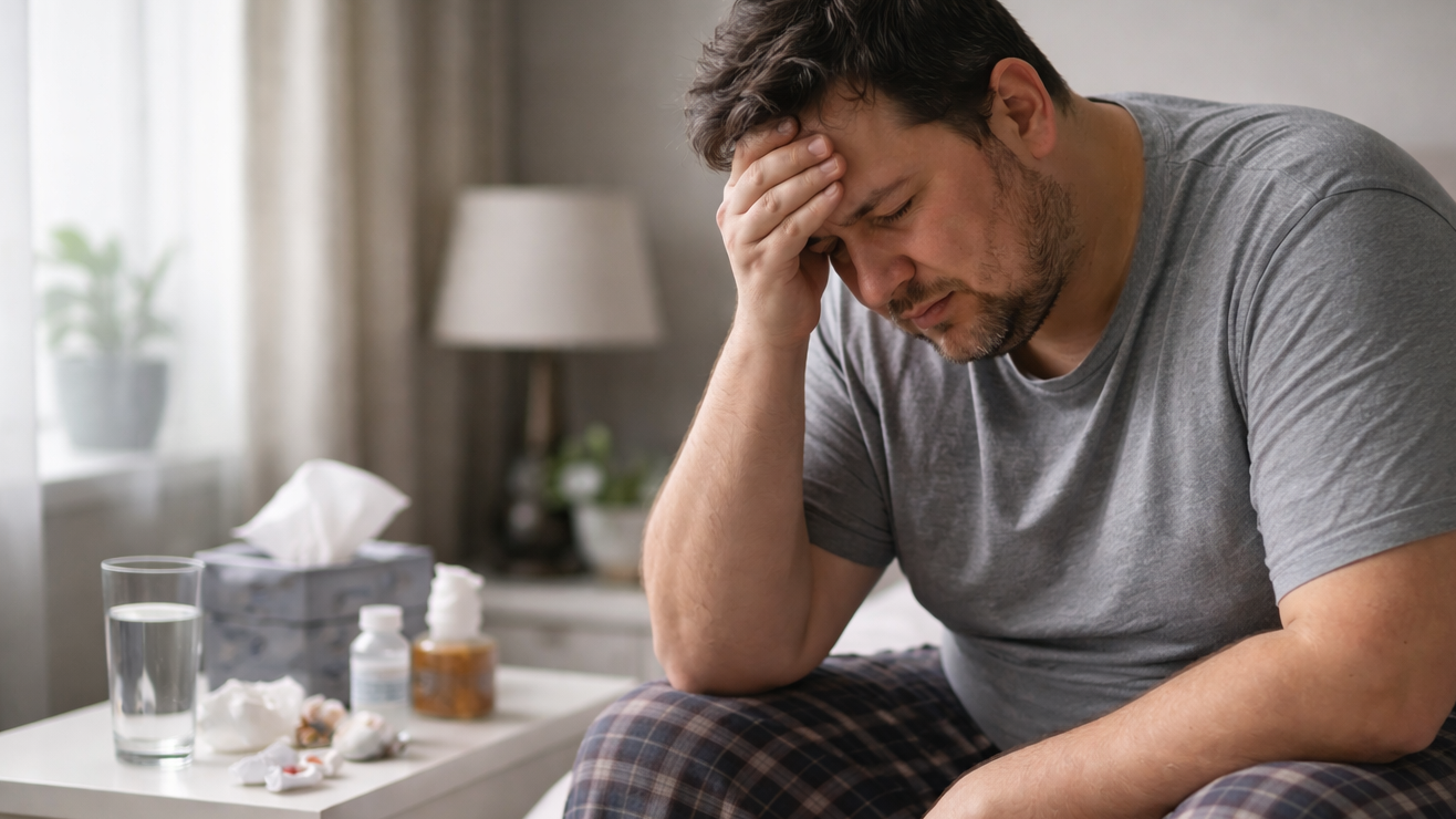 Hombre con sobrepeso sentado en su cama mostrando signos de malestar físico y cansancio