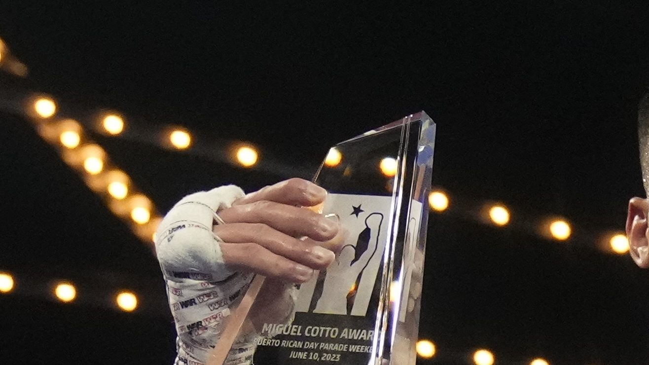 Xander Zayas, de Puerto Rico, posa sosteniendo el premio Miguel Cotto. Crédito: Frank Franklin II | AP