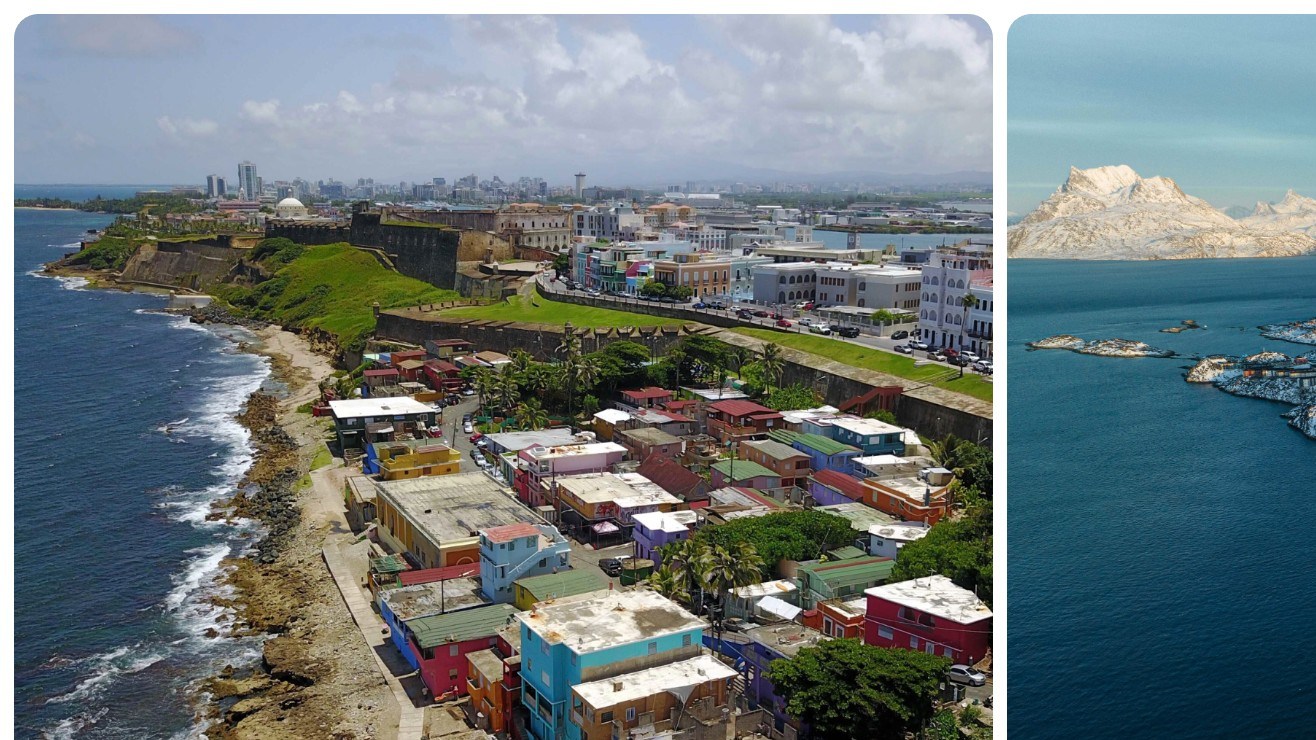 Vistas aéreas de Nuuk, Groenlandia, y de San Juan, Puerto Rico. Crédito: AP