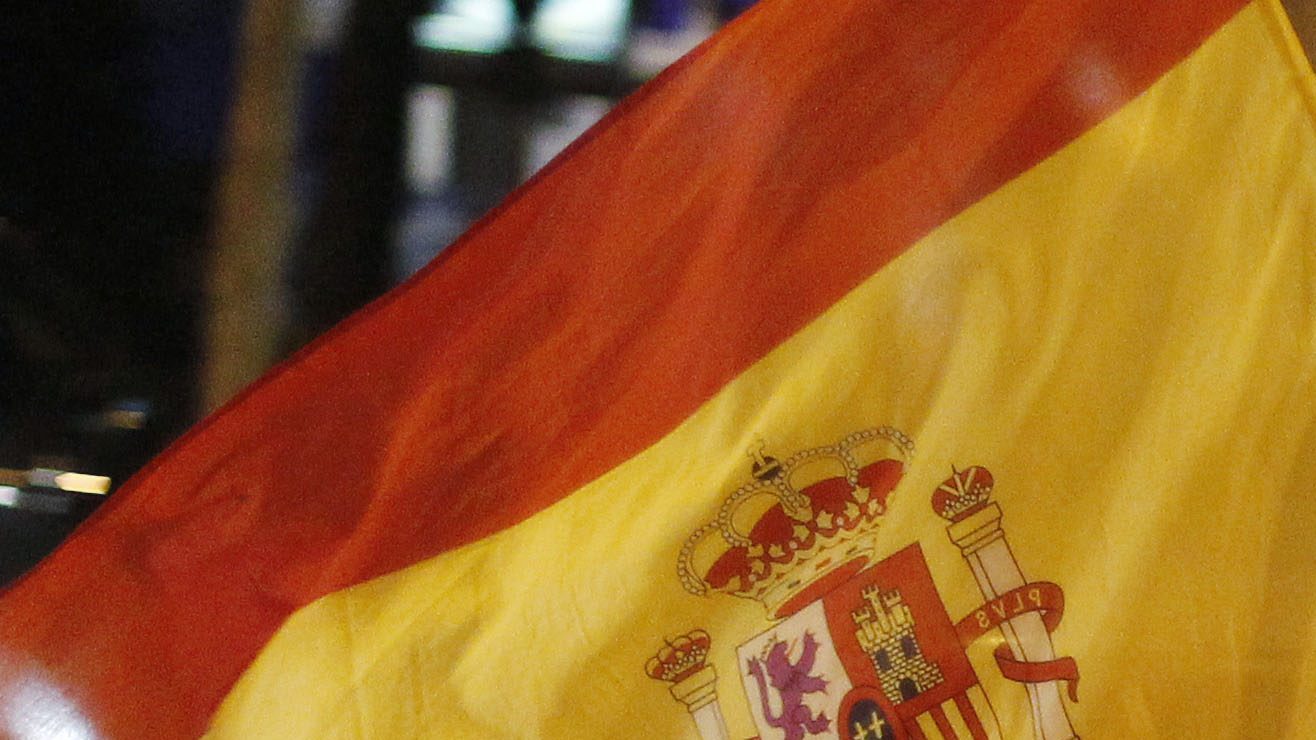 Un aficionado español en Madrid ondea una bandera de España mientras celebra tras el partido de semifinales del Mundial 2010 entre España y Alemania. La Roja ganó el partido por 1-0 y se clasificó para la final. Crédito: Paul White | AP