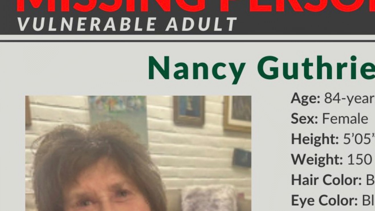 Imagen proporcionada por el Departamento del Sheriff del Condado de Pima, el lunes 2 de febrero de 2026, muestra una alerta de persona desaparecida para Nancy Guthrie. (Pima County Sheriff's Department via AP) Crédito: Cortesía