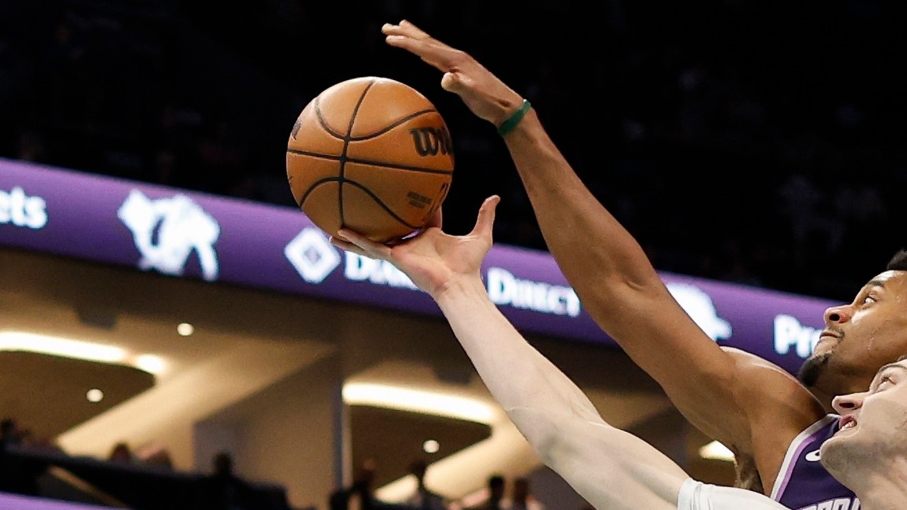El pívot de los Charlotte Hornets, Ryan Kalkbrenner (11), disputa un rebote con el pívot de los Sacramento Kings, Dylan Cardwell, durante la primera mitad de un partido de baloncesto de la NBA en Charlotte, Carolina del Norte, el martes 24 de marzo de 2026. Crédito: Nell Redmond | AP