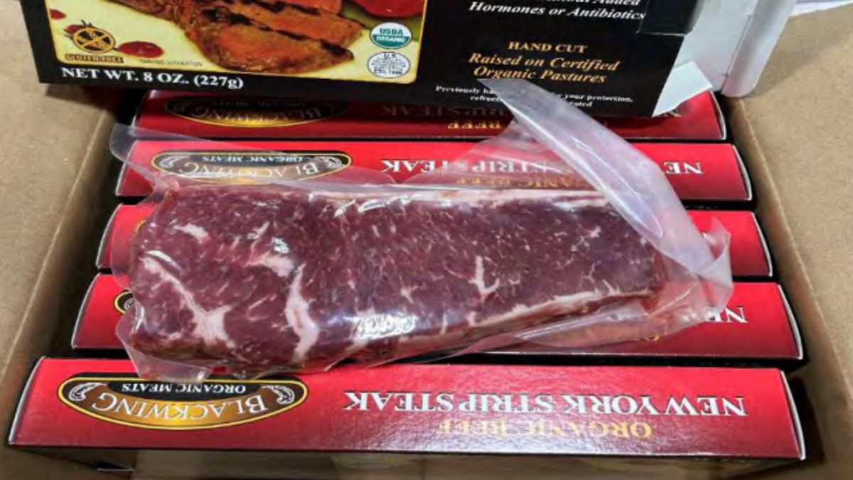 - Blackwing Organic Meats Organic Beef Steak Strips: Paquetes de 227 g (8 oz) en cajas de 2.27 kg (5 lb). Con sello falso “EST. 1996”.