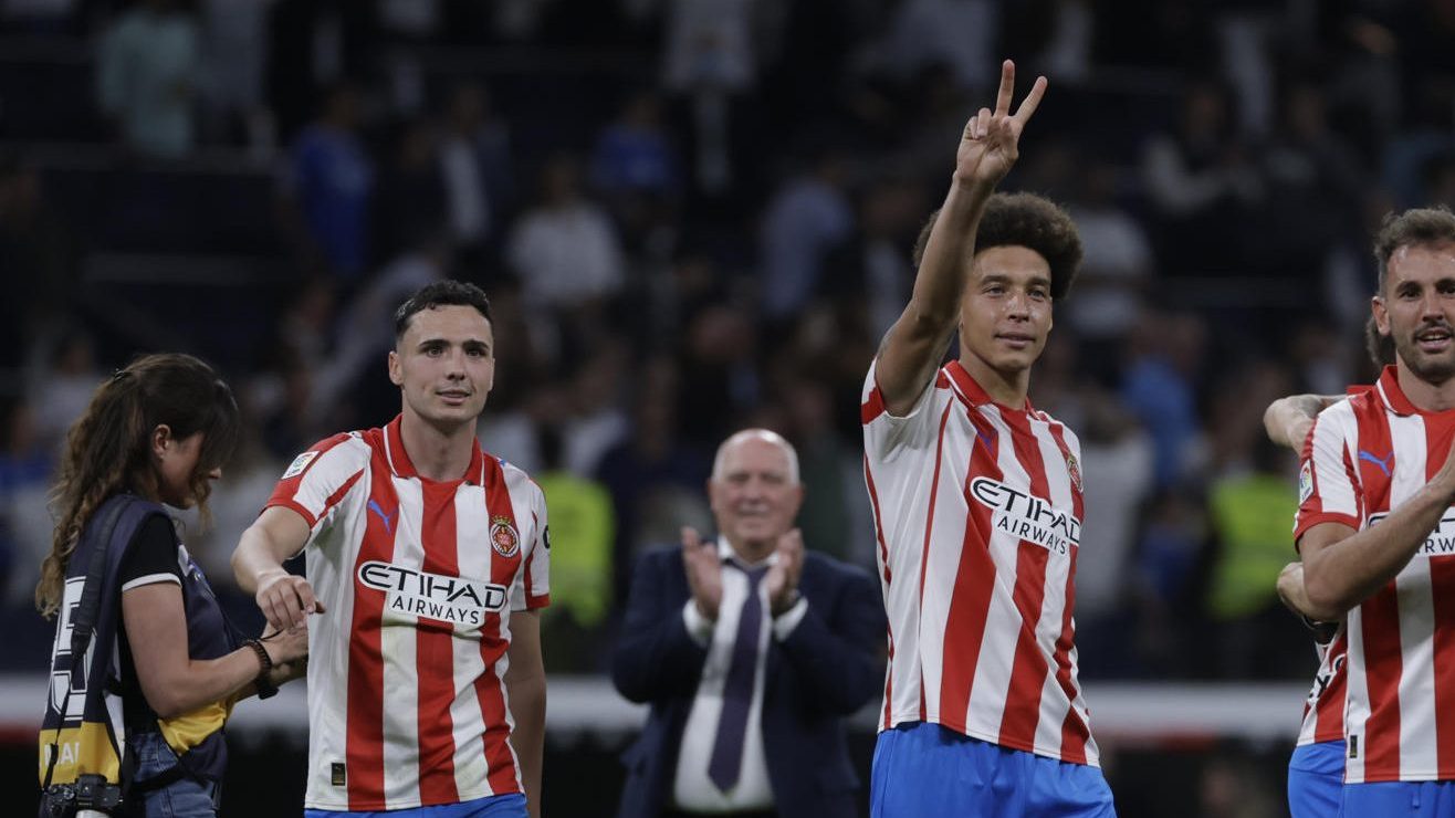 Los jugadores del Girona celebran el empate, al término del partido de LaLiga EA Sports que Real Madrid y Girona FC han disputado este viernes en el estadio Santiago Bernabéu. Crédito: Juanjo Martín | AP
