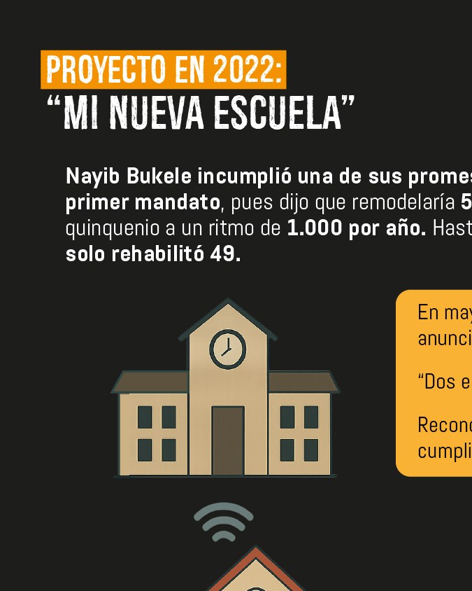 Luego, el 7 de septiembre de 2022, a mediados de su primer gobierno, dijo que construiría mil escuelas por año, una meta que no logró cumplir y al final de su primer periodo el Ministerio de Educación cerró 72 centros escolares, mientras que el Ministerio de Hacienda redujo 31 millones del presupuesto 2024-2025 a esta cartera.